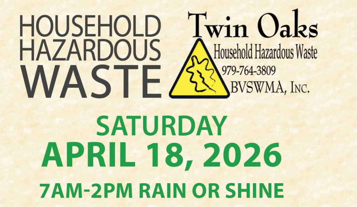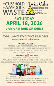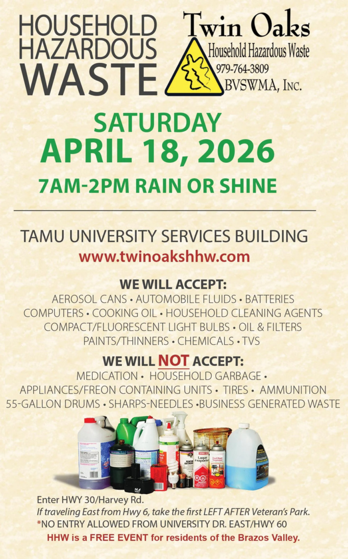 The Twin Oaks Landfill along with the cities of Bryan and College Station offer a FREE HHW collection event in April and October of each year for residents of the Brazos Valley. At this event, residents of the Brazos Valley can properly dispose of unwanted hazardous waste items. Each year this event collects approximately 300,000 pounds of household hazardous waste. Items commonly collected include (but are not limited to):