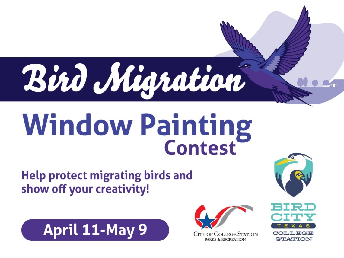 To help prevent bird strikes, decorate your windows with Texas spring bird migration–themed designs and submit a photo of your painted window to parks@cstx.gov by noon on May 8. Designs should use solid patterns with gaps no larger than 2 inches.